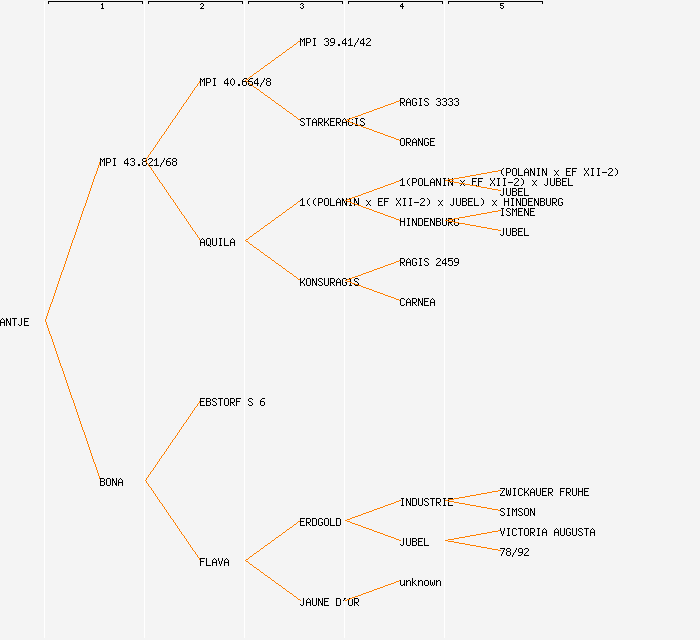 change image tree depth:     Show year of release (when known): ANTJE (1959) MPI 43.821/68 BONA (1944) MPI 40.664/8 AQUILA (1942) EBSTORF S 6 FLAVA (1931) MPI 39.41/42 STARKERAGIS (1933) 1((POLANIN x EF XII-2) x JUBEL) x HINDENBURG (1942) KONSURAGIS (1930) ERDGOLD (1928) JAUNE D'OR (<1850) RAGIS 3333 ORANGE 1(POLANIN x EF XII-2) x JUBEL (1942) HINDENBURG (1916) RAGIS 2459 CARNEA INDUSTRIE (1900) JUBEL (1908) unknown (POLANIN x EF XII-2) JUBEL ISMENE JUBEL ZWICKAUER FRUHE SIMSON VICTORIA AUGUSTA 78/92