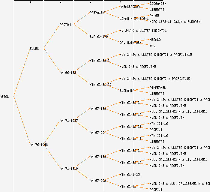 change image tree depth:     Show year of release (when known): ASTOL (1994) ELLES (1988) AM 76-1048 PROTON (1972) AM 66-182 AM 71-1987 AM 71-1319 PREVALENT (1966) SVP 60-179 VTN 62-33-3 VTN 62-31-30 AM 67-136 AM 67-59 AM 67-136 AM 67-292 AMBASSADEUR (1957) LOMAN M 54-106-1 (V 24/40 x ULSTER KNIGHT)1 DR. McINTOSH (1944) ((V 24/20 x ULSTER KNIGHT)1 x PROFIJT)15 (VRN I-3 x PROFIJT)5 ((V 24/20 x ULSTER KNIGHT) x PROFIJT)15 BURMANIA (1957) VTN 62-33-3 VTN 62-39-17 VTN 61-12-31 VTN 61-11-43 VTN 62-33-3 VTN 62-39-17 VTN 61-1-35 VTN 62-41-4 1256A(23) LIBERTAS PH 65 (CPC 1673-11 (adg) x FURORE) HERALD phu PIMPERNEL LIBERTAS ((V 24/20 x ULSTER KNIGHT)1 x PROFIJT)15 (VRN I-3 x PROFIJT)5 (LU. 57.1386/53 N x LI. 1364/52) (VRN I-3 x PROFIJT) VRN III-16 PROFIJT VRN III-16 LIBERTAS ((V 24/20 x ULSTER KNIGHT)1 x PROFIJT)15 (VRN I-3 x PROFIJT)5 (LU. 57.1386/53 N x LI. 1364/52) (VRN I-3 x PROFIJT) (VRN I-3 x (LU. 57.1386/53 N x SCHWALBE)) PROFIJT