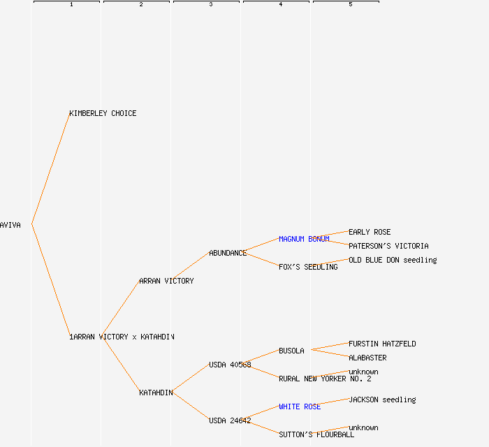 change image tree depth:     Show year of release (when known): AVIVA (1997) KIMBERLEY CHOICE (1972) 1ARRAN VICTORY x KATAHDIN (1997) ARRAN VICTORY (1918) KATAHDIN (1932) ABUNDANCE (1886) USDA 40568 USDA 24642 MAGNUM BONUM (1876) FOX'S SEEDLING (1820) BUSOLA RURAL NEW YORKER NO. 2 (1888) WHITE ROSE (1871) SUTTON'S FLOURBALL (1870) EARLY ROSE PATERSON'S VICTORIA OLD BLUE DON seedling FURSTIN HATZFELD ALABASTER unknown JACKSON seedling unknown