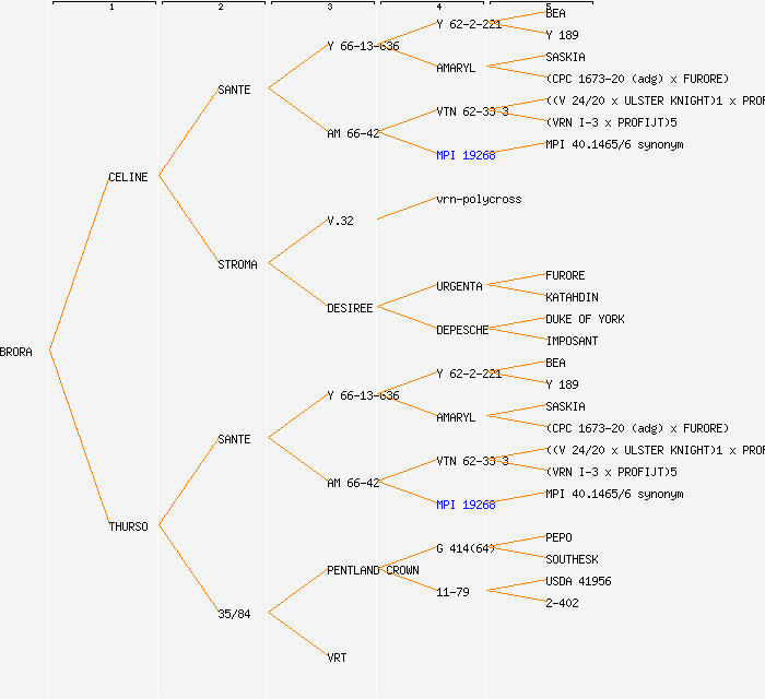 change image tree depth:     Show year of release (when known): BRORA (2000) CELINE (1999) THURSO SANTE (1983) STROMA (1989) SANTE (1983) 35/84 Y 66-13-636 AM 66-42 V.32 DESIREE (1962) Y 66-13-636 AM 66-42 PENTLAND CROWN (1959) VRT Y 62-2-221 AMARYL (1963) VTN 62-33-3 MPI 19268 vrn-polycross URGENTA (1951) DEPESCHE (1942) Y 62-2-221 AMARYL (1963) VTN 62-33-3 MPI 19268 G 414(64) 11-79 BEA Y 189 SASKIA (CPC 1673-20 (adg) x FURORE) ((V 24/20 x ULSTER KNIGHT)1 x PROFIJT)15 (VRN I-3 x PROFIJT)5 MPI 40.1465/6 synonym FURORE KATAHDIN DUKE OF YORK IMPOSANT BEA Y 189 SASKIA (CPC 1673-20 (adg) x FURORE) ((V 24/20 x ULSTER KNIGHT)1 x PROFIJT)15 (VRN I-3 x PROFIJT)5 MPI 40.1465/6 synonym PEPO SOUTHESK USDA 41956 2-402