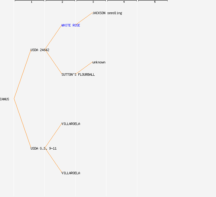 change image tree depth:     Show year of release (when known): CANUS (1949) USDA 24642 USDA G.S. 9-11 WHITE ROSE (1871) SUTTON'S FLOURBALL (1870) VILLAROELA VILLAROELA JACKSON seedling unknown