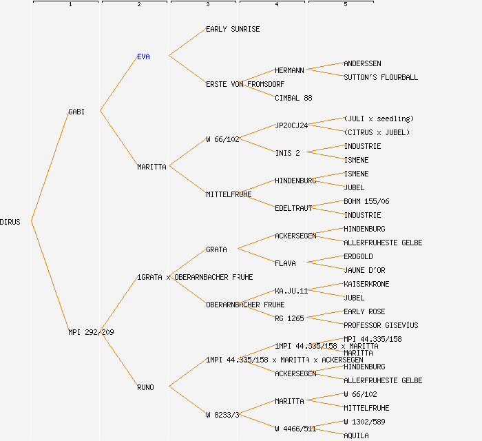 change image tree depth:     Show year of release (when known): DIRUS (1976) GABI (1965) MPI 292/209 EVA (1902) MARITTA (1947) 1GRATA x OBERARNBACHER FRUHE (1976) RUNO (1972) EARLY SUNRISE (<1883) ERSTE VON FROMSDORF (1884) W 66/102 MITTELFRUHE (1933) GRATA (1955) OBERARNBACHER FRUHE (1945) 1MPI 44.335/158 x MARITTA x ACKERSEGEN (1972) W 8233/3 HERMANN (1879) CIMBAL 88 JP20CJ24 INIS 2 (1929) HINDENBURG (1916) EDELTRAUT (1923) ACKERSEGEN (1929) FLAVA (1931) KA.JU.11 RG 1265 1MPI 44.335/158 x MARITTA (1972) ACKERSEGEN (1929) MARITTA (1947) W 4466/511 ANDERSSEN SUTTON'S FLOURBALL (JULI x seedling) (CITRUS x JUBEL) INDUSTRIE ISMENE ISMENE JUBEL BOHM 155/06 INDUSTRIE HINDENBURG ALLERFRUHESTE GELBE ERDGOLD JAUNE D'OR KAISERKRONE JUBEL EARLY ROSE PROFESSOR GISEVIUS MPI 44.335/158 MARITTA HINDENBURG ALLERFRUHESTE GELBE W 66/102 MITTELFRUHE W 1302/589 AQUILA