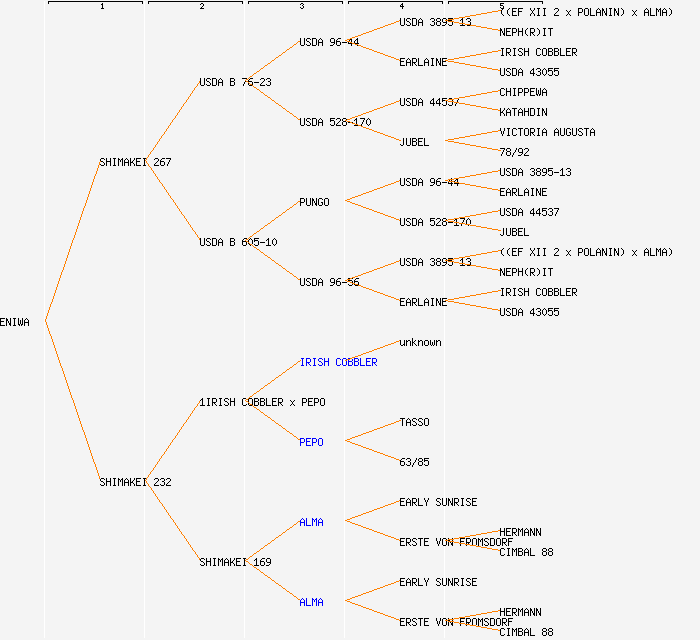 change image tree depth:     Show year of release (when known): ENIWA (1961) SHIMAKEI 267 SHIMAKEI 232 USDA B 76-23 USDA B 605-10 1IRISH COBBLER x PEPO (1961) SHIMAKEI 169 USDA 96-44 USDA 528-170 PUNGO (1950) USDA 96-56 IRISH COBBLER (1876) PEPO ALMA (1904) ALMA (1904) USDA 3895-13 EARLAINE (1937) USDA 44537 JUBEL (1908) USDA 96-44 USDA 528-170 USDA 3895-13 EARLAINE (1937) unknown TASSO 63/85 EARLY SUNRISE (<1883) ERSTE VON FROMSDORF (1884) EARLY SUNRISE (<1883) ERSTE VON FROMSDORF (1884) ((EF XII 2 x POLANIN) x ALMA) NEPH(R)IT IRISH COBBLER USDA 43055 CHIPPEWA KATAHDIN VICTORIA AUGUSTA 78/92 USDA 3895-13 EARLAINE USDA 44537 JUBEL ((EF XII 2 x POLANIN) x ALMA) NEPH(R)IT IRISH COBBLER USDA 43055 HERMANN CIMBAL 88 HERMANN CIMBAL 88