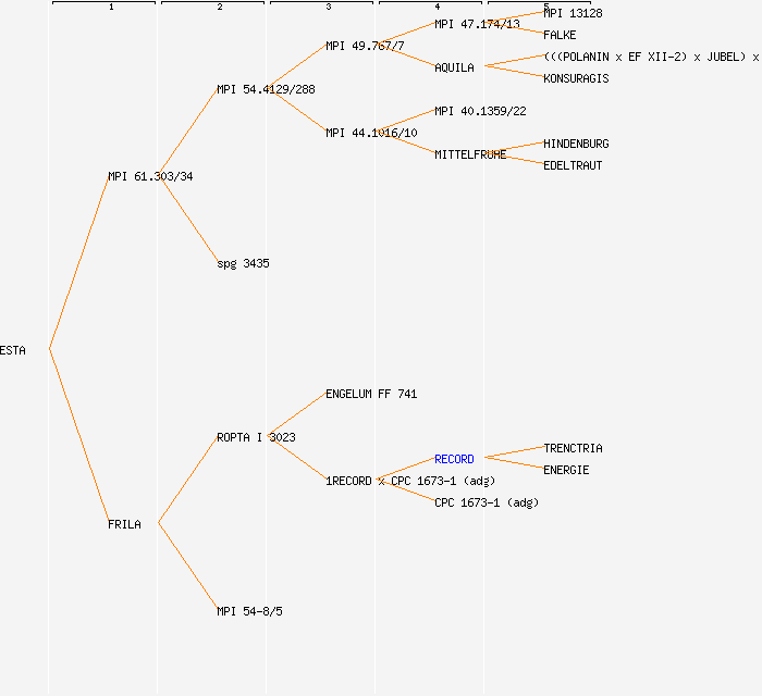 change image tree depth:     Show year of release (when known): ESTA (1978) MPI 61.303/34 FRILA (1968) MPI 54.4129/288 spg 3435 ROPTA I 3023 MPI 54-8/5 MPI 49.767/7 MPI 44.1016/10 ENGELUM FF 741 1RECORD x CPC 1673-1 (adg) (1968) MPI 47.174/13 AQUILA (1942) MPI 40.1359/22 MITTELFRUHE (1933) RECORD (1932) CPC 1673-1 (adg) MPI 13128 FALKE (((POLANIN x EF XII-2) x JUBEL) x HINDENBURG) KONSURAGIS HINDENBURG EDELTRAUT TRENCTRIA ENERGIE