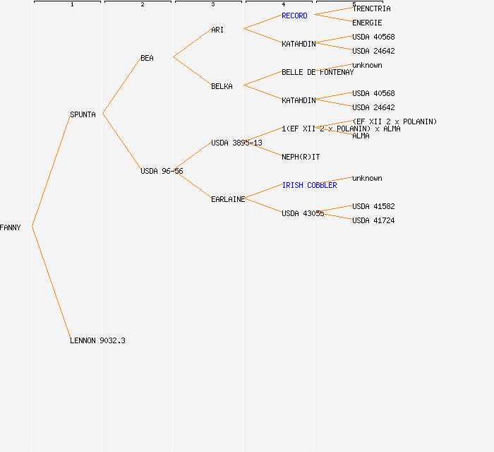 change image tree depth:     Show year of release (when known): FANNY (1986) SPUNTA (1968) LENNON 9032.3 BEA (1954) USDA 96-56 ARI (1950) BELKA USDA 3895-13 EARLAINE (1937) RECORD (1932) KATAHDIN (1932) BELLE DE FONTENAY (1885) KATAHDIN (1932) 1(EF XII 2 x POLANIN) x ALMA (1968) NEPH(R)IT IRISH COBBLER (1876) USDA 43055 TRENCTRIA ENERGIE USDA 40568 USDA 24642 unknown USDA 40568 USDA 24642 (EF XII 2 x POLANIN) ALMA unknown USDA 41582 USDA 41724