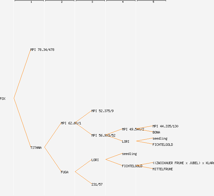 change image tree depth:     Show year of release (when known): FOX (1985) MPI 78.34/478 TITANA (1978) MPI 62.60/1 FUGA (1973) MPI 52.375/9 MPI 56.993/52 LORI (1953) 231/57 MPI 49.540/2 LORI (1953) seedling FICHTELGOLD (1945) MPI 44.335/130 BONA seedling FICHTELGOLD ((ZWICKAUER FRUHE x JUBEL) x KLARA) MITTELFRUHE
