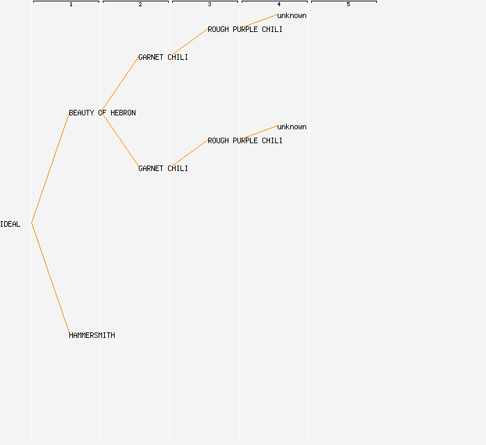 change image tree depth:     Show year of release (when known): IDEAL (1898) BEAUTY OF HEBRON (1878) HAMMERSMITH GARNET CHILI (1857) GARNET CHILI (1857) ROUGH PURPLE CHILI (<1851) ROUGH PURPLE CHILI (<1851) unknown unknown