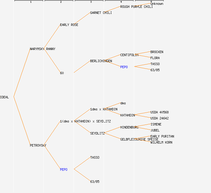 change image tree depth:     Show year of release (when known): IDEAL (1967) NARYMSKY RANNY (1961) PETROVSKY (1952) EARLY ROSE (1867) 60 1(dms x KATAHDIN) x SEYDLITZ (1952) PEPO GARNET CHILI (1857) BERLICHINGEN (1927) 1dms x KATAHDIN (1952) SEYDLITZ (1925) TASSO 63/85 ROUGH PURPLE CHILI (<1851) CENTIFOLIA (1919) PEPO dms KATAHDIN (1932) HINDENBURG (1916) GELBFLEISCHIGE SPEISE unknown BROCKEN FLORA TASSO 63/85 USDA 40568 USDA 24642 ISMENE JUBEL EARLY PURITAN WILHELM KORN