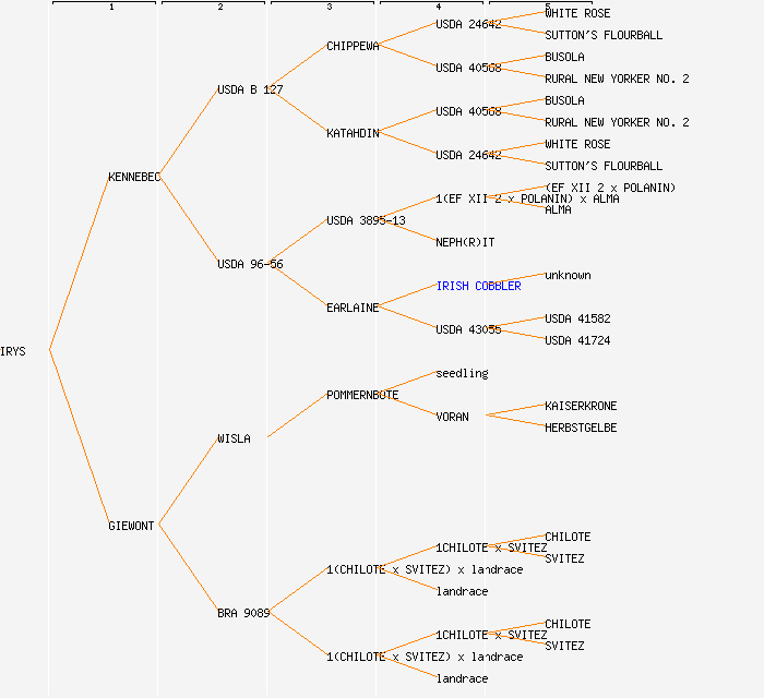 change image tree depth:     Show year of release (when known): IRYS (1975) KENNEBEC (1948) GIEWONT (1955) USDA B 127 USDA 96-56 WISLA BRA 9089 CHIPPEWA (1933) KATAHDIN (1932) USDA 3895-13 EARLAINE (1937) POMMERNBOTE (1946) 1(CHILOTE x SVITEZ) x landrace (1955) 1(CHILOTE x SVITEZ) x landrace (1955) USDA 24642 USDA 40568 USDA 40568 USDA 24642 1(EF XII 2 x POLANIN) x ALMA (1948) NEPH(R)IT IRISH COBBLER (1876) USDA 43055 seedling VORAN (1931) 1CHILOTE x SVITEZ (1955) landrace 1CHILOTE x SVITEZ (1955) landrace WHITE ROSE SUTTON'S FLOURBALL BUSOLA RURAL NEW YORKER NO. 2 BUSOLA RURAL NEW YORKER NO. 2 WHITE ROSE SUTTON'S FLOURBALL (EF XII 2 x POLANIN) ALMA unknown USDA 41582 USDA 41724 KAISERKRONE HERBSTGELBE CHILOTE SVITEZ CHILOTE SVITEZ