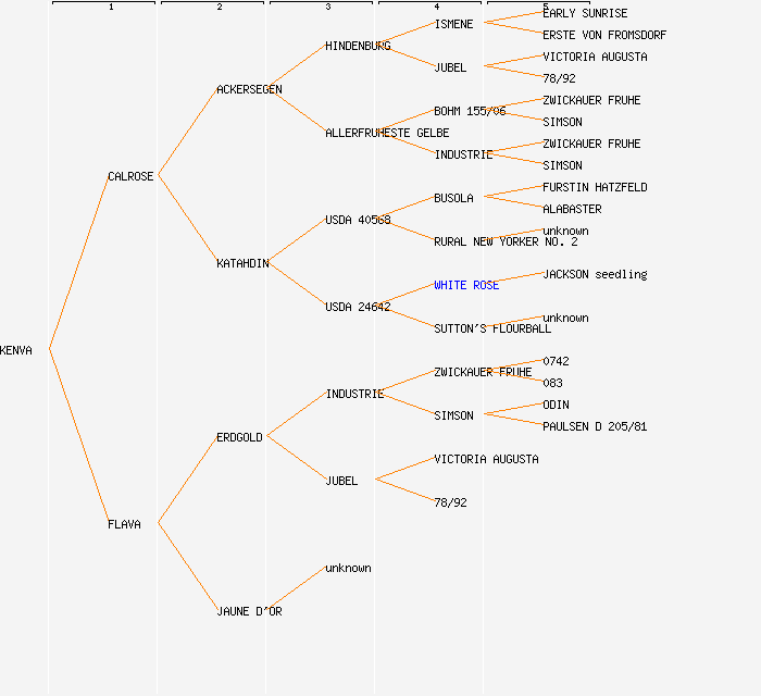 change image tree depth:     Show year of release (when known): KENVA (1969) CALROSE (1946) FLAVA (1931) ACKERSEGEN (1929) KATAHDIN (1932) ERDGOLD (1928) JAUNE D'OR (<1850) HINDENBURG (1916) ALLERFRUHESTE GELBE (1922) USDA 40568 USDA 24642 INDUSTRIE (1900) JUBEL (1908) unknown ISMENE (1903) JUBEL (1908) BOHM 155/06 INDUSTRIE (1900) BUSOLA RURAL NEW YORKER NO. 2 (1888) WHITE ROSE (1871) SUTTON'S FLOURBALL (1870) ZWICKAUER FRUHE (1883) SIMSON (1888) VICTORIA AUGUSTA 78/92 EARLY SUNRISE ERSTE VON FROMSDORF VICTORIA AUGUSTA 78/92 ZWICKAUER FRUHE SIMSON ZWICKAUER FRUHE SIMSON FURSTIN HATZFELD ALABASTER unknown JACKSON seedling unknown 0742 083 ODIN PAULSEN D 205/81