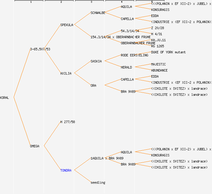 change image tree depth:     Show year of release (when known): KORAL (1987) 3-65.507/53 OMEGA (1971) SPEKULA (1961) AXILIA (1966) H 277/58 TONDRA (1960) SCHWALBE (1956) 154.3/14/34 x OBERARNBACHER FRUHE (1961) SASKIA (1946) ORA (1952) 1AQUILA x BRA 9089 (1960) seedling AQUILA (1942) CAPELLA (1943) 54.3/14/34 OBERARNBACHER FRUHE (1945) RODE EERSTELING (1933) HERALD (1928) CAPELLA (1943) BRA 9089 AQUILA (1942) BRA 9089 (((POLANIN x EF XII-2) x JUBEL) x HINDENBURG) KONSURAGIS EDDA (INDUSTRIE x (EF XII-2 x POLANIN)) Z 20/28 H 4/31 KA.JU.11 RG 1265 DUKE OF YORK mutant MAJESTIC ABUNDANCE EDDA (INDUSTRIE x (EF XII-2 x POLANIN)) ((CHILOTE x SVITEZ) x landrace) ((CHILOTE x SVITEZ) x landrace) (((POLANIN x EF XII-2) x JUBEL) x HINDENBURG) KONSURAGIS ((CHILOTE x SVITEZ) x landrace) ((CHILOTE x SVITEZ) x landrace)