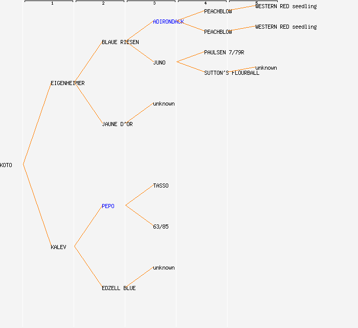 change image tree depth:     Show year of release (when known): KOTO (1961) EIGENHEIMER (1895) KALEV (1933) BLAUE RIESEN (1883) JAUNE D'OR (<1850) PEPO EDZELL BLUE (<1890) ADIRONDACK (1881) JUNO (<1889) unknown TASSO 63/85 unknown PEACHBLOW (<1865) PEACHBLOW (<1865) PAULSEN 7/79R SUTTON'S FLOURBALL (1870) WESTERN RED seedling WESTERN RED seedling unknown