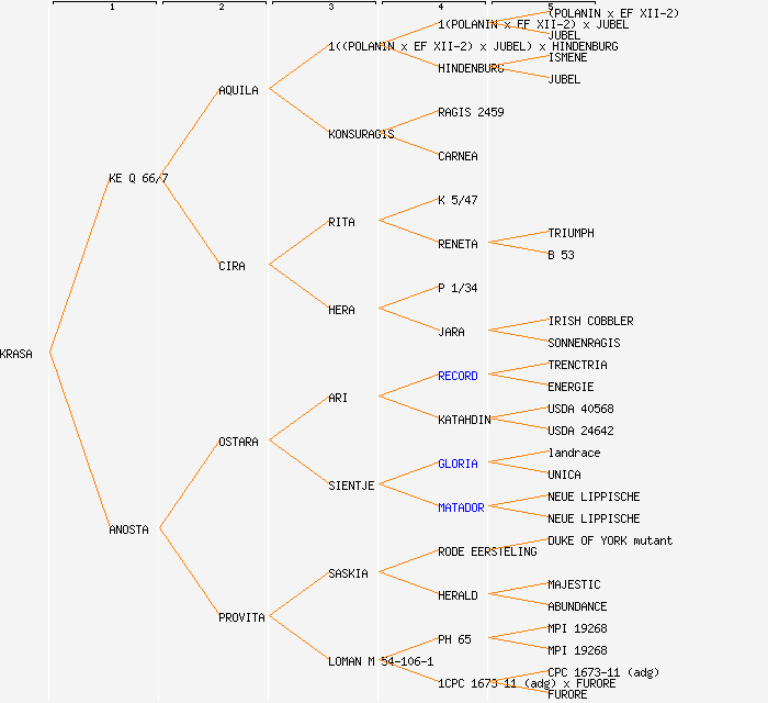 change image tree depth:     Show year of release (when known): KRASA (1991) KE Q 66/7 ANOSTA (1975) AQUILA (1942) CIRA (1974) OSTARA (1961) PROVITA (1967) 1((POLANIN x EF XII-2) x JUBEL) x HINDENBURG (1942) KONSURAGIS (1930) RITA (1962) HERA (1962) ARI (1950) SIENTJE (1951) SASKIA (1946) LOMAN M 54-106-1 1(POLANIN x EF XII-2) x JUBEL (1942) HINDENBURG (1916) RAGIS 2459 CARNEA K 5/47 RENETA (1939) P 1/34 JARA (1956) RECORD (1932) KATAHDIN (1932) GLORIA (1933) MATADOR (1879) RODE EERSTELING (1933) HERALD (1928) PH 65 1CPC 1673-11 (adg) x FURORE (1967) (POLANIN x EF XII-2) JUBEL ISMENE JUBEL TRIUMPH B 53 IRISH COBBLER SONNENRAGIS TRENCTRIA ENERGIE USDA 40568 USDA 24642 landrace UNICA NEUE LIPPISCHE NEUE LIPPISCHE DUKE OF YORK mutant MAJESTIC ABUNDANCE MPI 19268 MPI 19268 CPC 1673-11 (adg) FURORE
