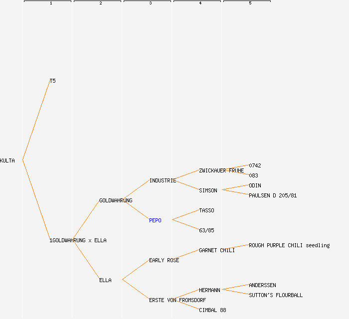 change image tree depth:     Show year of release (when known): KULTA (1997) T5 1GOLDWAHRUNG x ELLA (1997) GOLDWAHRUNG (1931) ELLA (1898) INDUSTRIE (1900) PEPO EARLY ROSE (1867) ERSTE VON FROMSDORF (1884) ZWICKAUER FRUHE (1883) SIMSON (1888) TASSO 63/85 GARNET CHILI (1857) HERMANN (1879) CIMBAL 88 0742 083 ODIN PAULSEN D 205/81 ROUGH PURPLE CHILI seedling ANDERSSEN SUTTON'S FLOURBALL