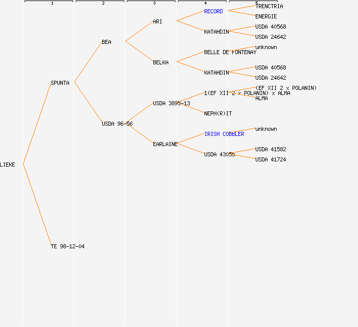 change image tree depth:     Show year of release (when known): LIEKE (2014) SPUNTA (1968) TE 98-12-04 BEA (1954) USDA 96-56 ARI (1950) BELKA USDA 3895-13 EARLAINE (1937) RECORD (1932) KATAHDIN (1932) BELLE DE FONTENAY (1885) KATAHDIN (1932) 1(EF XII 2 x POLANIN) x ALMA (1968) NEPH(R)IT IRISH COBBLER (1876) USDA 43055 TRENCTRIA ENERGIE USDA 40568 USDA 24642 unknown USDA 40568 USDA 24642 (EF XII 2 x POLANIN) ALMA unknown USDA 41582 USDA 41724
