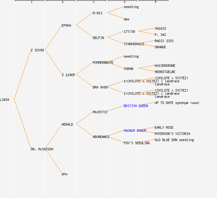 change image tree depth:     Show year of release (when known): LIWIA (1977) Z 32098 DR. McINTOSH (1944) EPOKA (1955) Z 11965 HERALD (1928) phu R-913 DELFIN (1946) POMMERNBOTE (1946) BRA 9089 MAJESTIC (1911) ABUNDANCE (1886) seedling dms 177/38 STARKERAGIS (1933) seedling VORAN (1931) 1(CHILOTE x SVITEZ) x landrace (1977) 1(CHILOTE x SVITEZ) x landrace (1977) BRITISH QUEEN MAGNUM BONUM (1876) FOX'S SEEDLING (1820) 341633 P. 342 RAGIS 3333 ORANGE KAISERKRONE HERBSTGELBE (CHILOTE x SVITEZ) landrace (CHILOTE x SVITEZ) landrace UP TO DATE synonym (usa) EARLY ROSE PATERSON'S VICTORIA OLD BLUE DON seedling