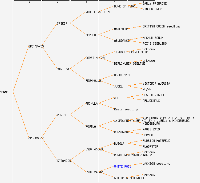 change image tree depth:     Show year of release (when known): MANNA (1975) ZPC 50-35 ZPC 55-37 SASKIA (1946) SIRTEMA (1947) VERTA (1957) KATAHDIN (1932) RODE EERSTELING (1933) HERALD (1928) DORST H 123A FRUHMOLLE (1931) PRIMULA (1939) AQUILA (1942) USDA 40568 USDA 24642 DUKE OF YORK (1891) MAJESTIC (1911) ABUNDANCE (1886) TINWALD'S PERFECTION (1914) BERLIKUMER GEELTJE (<1890) ASCHE 118 JUBEL (1908) JULI (1891) Ragis seedling 1((POLANIN x EF XII-2) x JUBEL) x HINDENBURG (1942) KONSURAGIS (1930) BUSOLA RURAL NEW YORKER NO. 2 (1888) WHITE ROSE (1871) SUTTON'S FLOURBALL (1870) EARLY PRIMROSE KING KIDNEY BRITISH QUEEN seedling MAGNUM BONUM FOX'S SEEDLING unknown unknown VICTORIA AUGUSTA 78/92 JOSEPH RIGAULT PFLUCKMAUS ((POLANIN x EF XII-2) x JUBEL) HINDENBURG RAGIS 2459 CARNEA FURSTIN HATZFELD ALABASTER unknown JACKSON seedling unknown