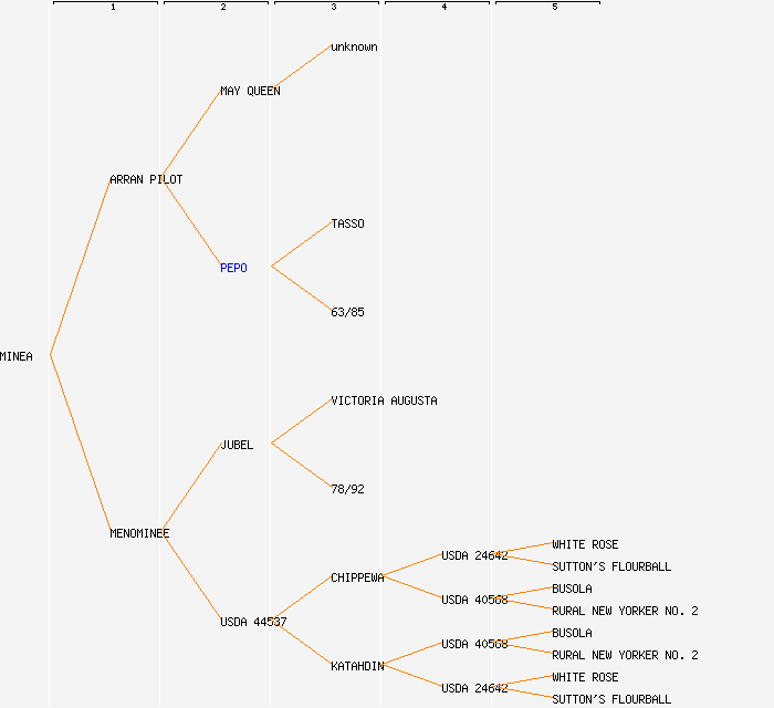 change image tree depth:     Show year of release (when known): MINEA (1963) ARRAN PILOT (1930) MENOMINEE (1944) MAY QUEEN (1890) PEPO JUBEL (1908) USDA 44537 unknown TASSO 63/85 VICTORIA AUGUSTA 78/92 CHIPPEWA (1933) KATAHDIN (1932) USDA 24642 USDA 40568 USDA 40568 USDA 24642 WHITE ROSE SUTTON'S FLOURBALL BUSOLA RURAL NEW YORKER NO. 2 BUSOLA RURAL NEW YORKER NO. 2 WHITE ROSE SUTTON'S FLOURBALL