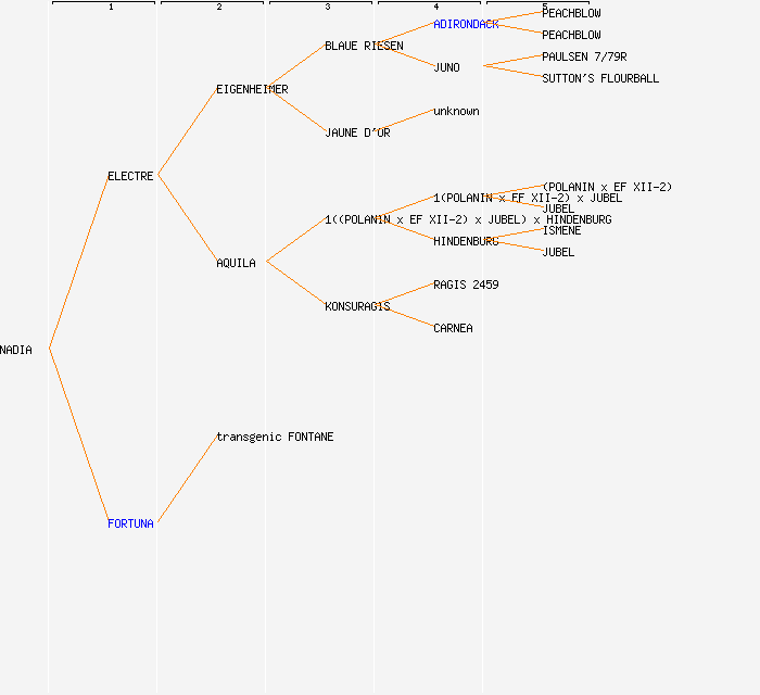 change image tree depth:     Show year of release (when known): NADIA (1968) ELECTRE (1955) FORTUNA EIGENHEIMER (1895) AQUILA (1942) transgenic FONTANE BLAUE RIESEN (1883) JAUNE D'OR (<1850) 1((POLANIN x EF XII-2) x JUBEL) x HINDENBURG (1942) KONSURAGIS (1930) ADIRONDACK (1881) JUNO (<1889) unknown 1(POLANIN x EF XII-2) x JUBEL (1942) HINDENBURG (1916) RAGIS 2459 CARNEA PEACHBLOW PEACHBLOW PAULSEN 7/79R SUTTON'S FLOURBALL (POLANIN x EF XII-2) JUBEL ISMENE JUBEL