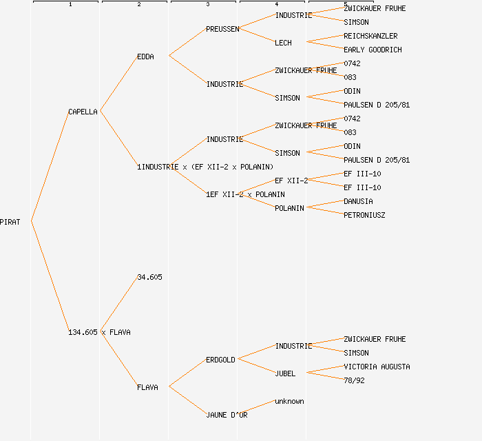 change image tree depth:     Show year of release (when known): PIRAT (1958) CAPELLA (1943) 134.605 x FLAVA (1958) EDDA (1932) 1INDUSTRIE x (EF XII-2 x POLANIN) (1943) 34.605 FLAVA (1931) PREUSSEN (1917) INDUSTRIE (1900) INDUSTRIE (1900) 1EF XII-2 x POLANIN (1943) ERDGOLD (1928) JAUNE D'OR (<1850) INDUSTRIE (1900) LECH (1893) ZWICKAUER FRUHE (1883) SIMSON (1888) ZWICKAUER FRUHE (1883) SIMSON (1888) EF XII-2 POLANIN INDUSTRIE (1900) JUBEL (1908) unknown ZWICKAUER FRUHE SIMSON REICHSKANZLER EARLY GOODRICH 0742 083 ODIN PAULSEN D 205/81 0742 083 ODIN PAULSEN D 205/81 EF III-10 EF III-10 DANUSIA PETRONIUSZ ZWICKAUER FRUHE SIMSON VICTORIA AUGUSTA 78/92