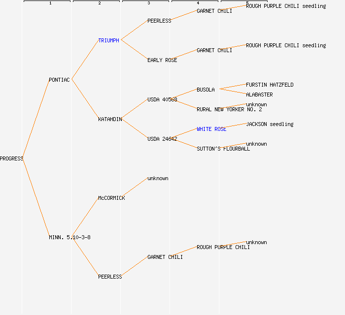 change image tree depth:     Show year of release (when known): PROGRESS (1950) PONTIAC (1938) MINN. 5.10-3-8 TRIUMPH (1878) KATAHDIN (1932) McCORMICK (1882) PEERLESS (1862) PEERLESS (1862) EARLY ROSE (1867) USDA 40568 USDA 24642 unknown GARNET CHILI (1857) GARNET CHILI (1857) GARNET CHILI (1857) BUSOLA RURAL NEW YORKER NO. 2 (1888) WHITE ROSE (1871) SUTTON'S FLOURBALL (1870) ROUGH PURPLE CHILI (<1851) ROUGH PURPLE CHILI seedling ROUGH PURPLE CHILI seedling FURSTIN HATZFELD ALABASTER unknown JACKSON seedling unknown unknown