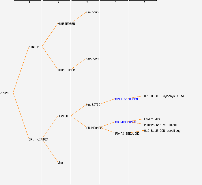 change image tree depth:     Show year of release (when known): ROSVA (1972) BINTJE (1910) DR. McINTOSH (1944) MUNSTERSEN (<1890) JAUNE D'OR (<1850) HERALD (1928) phu unknown unknown MAJESTIC (1911) ABUNDANCE (1886) BRITISH QUEEN MAGNUM BONUM (1876) FOX'S SEEDLING (1820) UP TO DATE synonym (usa) EARLY ROSE PATERSON'S VICTORIA OLD BLUE DON seedling