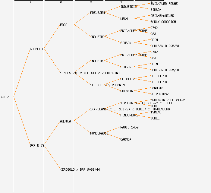 change image tree depth:     Show year of release (when known): SPATZ (1958) CAPELLA (1943) BRA D 79 EDDA (1932) 1INDUSTRIE x (EF XII-2 x POLANIN) (1943) AQUILA (1942) (ERDGOLD x BRA 9089)44 PREUSSEN (1917) INDUSTRIE (1900) INDUSTRIE (1900) 1EF XII-2 x POLANIN (1943) 1((POLANIN x EF XII-2) x JUBEL) x HINDENBURG (1942) KONSURAGIS (1930) INDUSTRIE (1900) LECH (1893) ZWICKAUER FRUHE (1883) SIMSON (1888) ZWICKAUER FRUHE (1883) SIMSON (1888) EF XII-2 POLANIN 1(POLANIN x EF XII-2) x JUBEL (1942) HINDENBURG (1916) RAGIS 2459 CARNEA ZWICKAUER FRUHE SIMSON REICHSKANZLER EARLY GOODRICH 0742 083 ODIN PAULSEN D 205/81 0742 083 ODIN PAULSEN D 205/81 EF III-10 EF III-10 DANUSIA PETRONIUSZ (POLANIN x EF XII-2) JUBEL ISMENE JUBEL