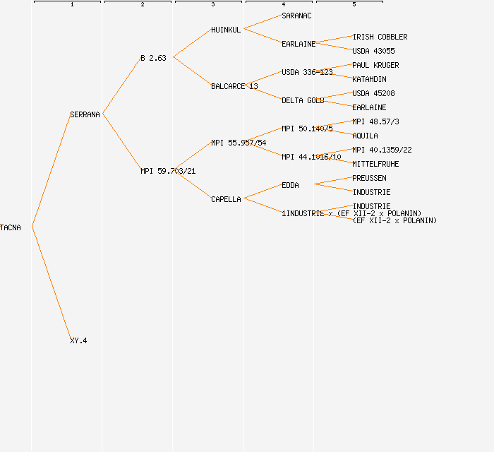 change image tree depth:     Show year of release (when known): TACNA (1993) SERRANA (1970) XY.4 B 2.63 MPI 59.703/21 HUINKUL (1946) BALCARCE 13 MPI 55.957/54 CAPELLA (1943) SARANAC EARLAINE (1937) USDA 336-123 DELTA GOLD MPI 50.140/5 MPI 44.1016/10 EDDA (1932) 1INDUSTRIE x (EF XII-2 x POLANIN) (1943) IRISH COBBLER USDA 43055 PAUL KRUGER KATAHDIN USDA 45208 EARLAINE MPI 48.57/3 AQUILA MPI 40.1359/22 MITTELFRUHE PREUSSEN INDUSTRIE INDUSTRIE (EF XII-2 x POLANIN)