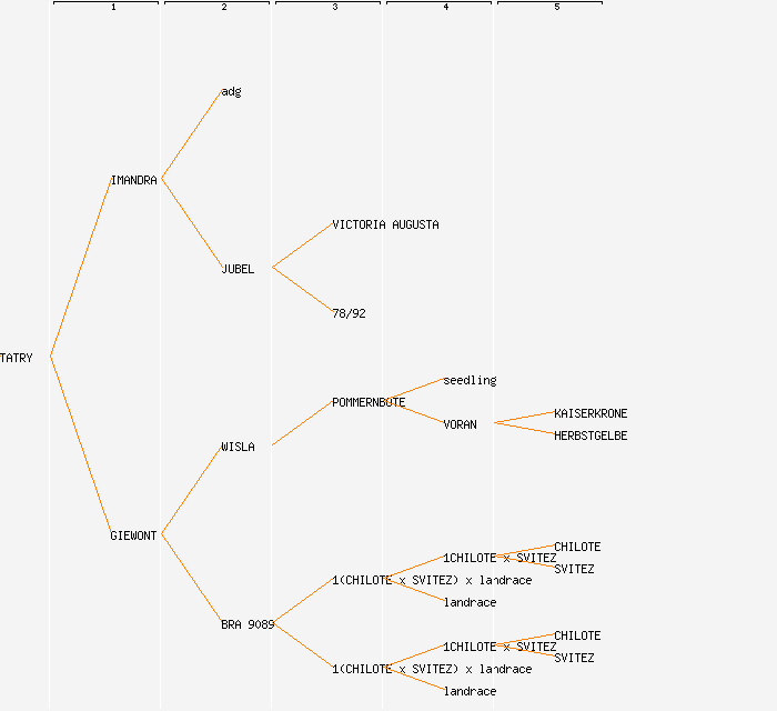 change image tree depth:     Show year of release (when known): TATRY (1960) IMANDRA (1934) GIEWONT (1955) adg JUBEL (1908) WISLA BRA 9089 VICTORIA AUGUSTA 78/92 POMMERNBOTE (1946) 1(CHILOTE x SVITEZ) x landrace (1955) 1(CHILOTE x SVITEZ) x landrace (1955) seedling VORAN (1931) 1CHILOTE x SVITEZ (1955) landrace 1CHILOTE x SVITEZ (1955) landrace KAISERKRONE HERBSTGELBE CHILOTE SVITEZ CHILOTE SVITEZ