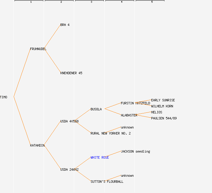 change image tree depth:     Show year of release (when known): TIMO (1975) FRUHNUDEL (1941) KATAHDIN (1932) BRA 4 KNEHDENER 45 USDA 40568 USDA 24642 BUSOLA RURAL NEW YORKER NO. 2 (1888) WHITE ROSE (1871) SUTTON'S FLOURBALL (1870) FURSTIN HATZFELD ALABASTER unknown JACKSON seedling unknown EARLY SUNRISE WILHELM KORN HELIOS PAULSEN 544/89