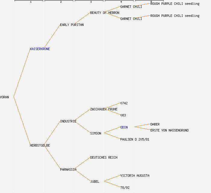 change image tree depth:     Show year of release (when known): VORAN (1931) KAISERKRONE HERBSTGELBE EARLY PURITAN (1888) INDUSTRIE (1900) PARNASSIA (1913) BEAUTY OF HEBRON (1878) ZWICKAUER FRUHE (1883) SIMSON (1888) DEUTSCHES REICH JUBEL (1908) GARNET CHILI (1857) GARNET CHILI (1857) 0742 083 ODIN (<1900) PAULSEN D 205/81 VICTORIA AUGUSTA 78/92 ROUGH PURPLE CHILI seedling ROUGH PURPLE CHILI seedling DABER ERSTE VON NASSENGRUND
