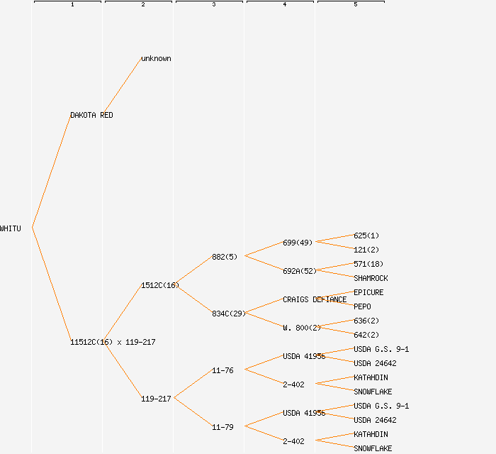 change image tree depth:     Show year of release (when known): WHITU (1973) DAKOTA RED (1883) 11512C(16) x 119-217 (1973) unknown 1512C(16) 119-217 882(5) 834C(29) 11-76 11-79 699(49) 692A(52) CRAIGS DEFIANCE (1938) W. 800(2) USDA 41956 2-402 USDA 41956 2-402 625(1) 121(2) 571(18) SHAMROCK EPICURE PEPO 636(2) 642(2) USDA G.S. 9-1 USDA 24642 KATAHDIN SNOWFLAKE USDA G.S. 9-1 USDA 24642 KATAHDIN SNOWFLAKE