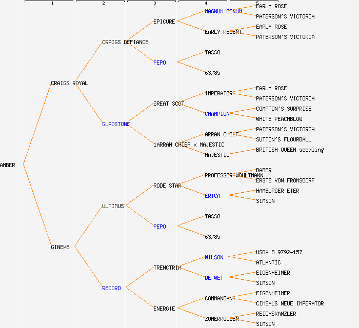 change image tree depth:     Show year of release (when known): AMBER (1973) CRAIGS ROYAL (1947) GINEKE (1950) CRAIGS DEFIANCE (1938) GLADSTONE (1932) ULTIMUS (1935) RECORD (1932) EPICURE (1897) PEPO GREAT SCOT (1909) 1ARRAN CHIEF x MAJESTIC (1932) RODE STAR (1908) PEPO TRENCTRIA (<1925) ENERGIE (1924) MAGNUM BONUM (1876) EARLY REGENT (1882) TASSO 63/85 IMPERATOR (1875) CHAMPION ARRAN CHIEF (1911) MAJESTIC (1911) PROFESSOR WOHLTMANN (1895) ERICA (1899) TASSO 63/85 WILSON DE WET (1902) COMMANDANT (1914) ZOMERROODEN (1894) EARLY ROSE PATERSON'S VICTORIA EARLY ROSE PATERSON'S VICTORIA EARLY ROSE PATERSON'S VICTORIA COMPTON'S SURPRISE WHITE PEACHBLOW PATERSON'S VICTORIA SUTTON'S FLOURBALL BRITISH QUEEN seedling DABER ERSTE VON FROMSDORF HAMBURGER EIER SIMSON USDA B 9792-157 ATLANTIC EIGENHEIMER SIMSON EIGENHEIMER CIMBALS NEUE IMPERATOR REICHSKANZLER SIMSON